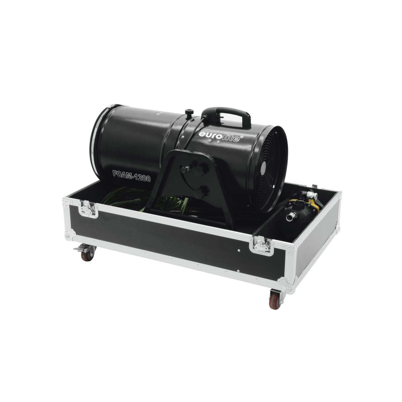 Stock disponibleUn beau débit de mousse avec ce canon FOAM 1200 de chez Eurolite, fonctionnement avec pompe fournie. Vous devez préparer votre solution mix eau+ fluide concentré mousse dans une cuve au préalable.